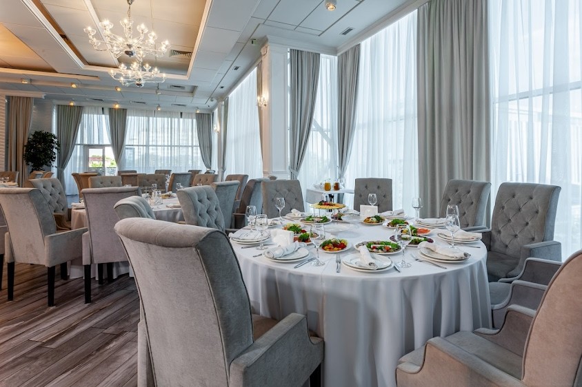 - Дизайнерская мебель, выполненная по спецзаказу, удобные стулья и круглые столы для европейской расстановки